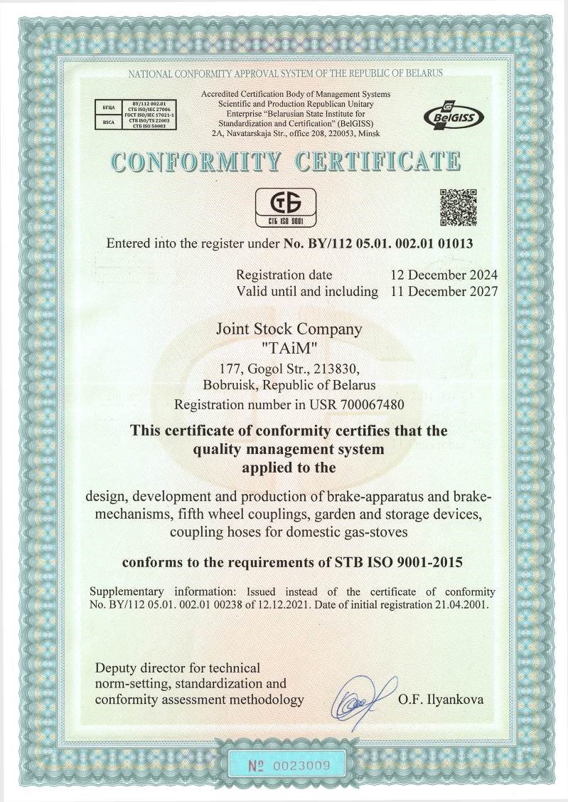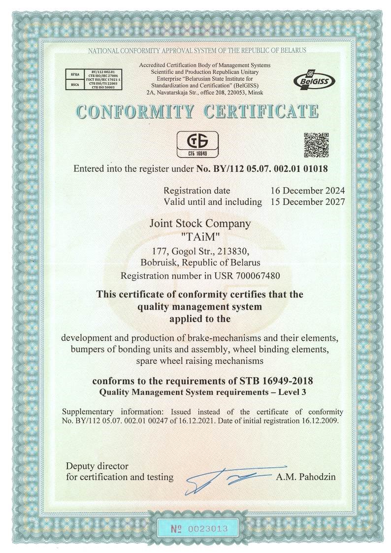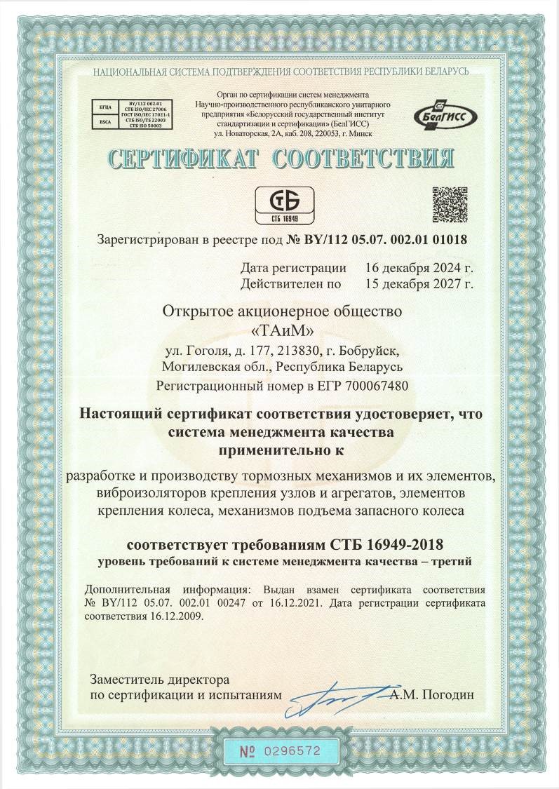 В 2024 г. проведен повторный аудит системы менеджмента качества ОАО "ТАиМ" на соответствие требованиям СТБ ISО 9001-2015 и СТБ 16949-2018 в Национальной системе подтверждения соответствия Республики Беларусь органом по сертификации систем управления БелГИСС.