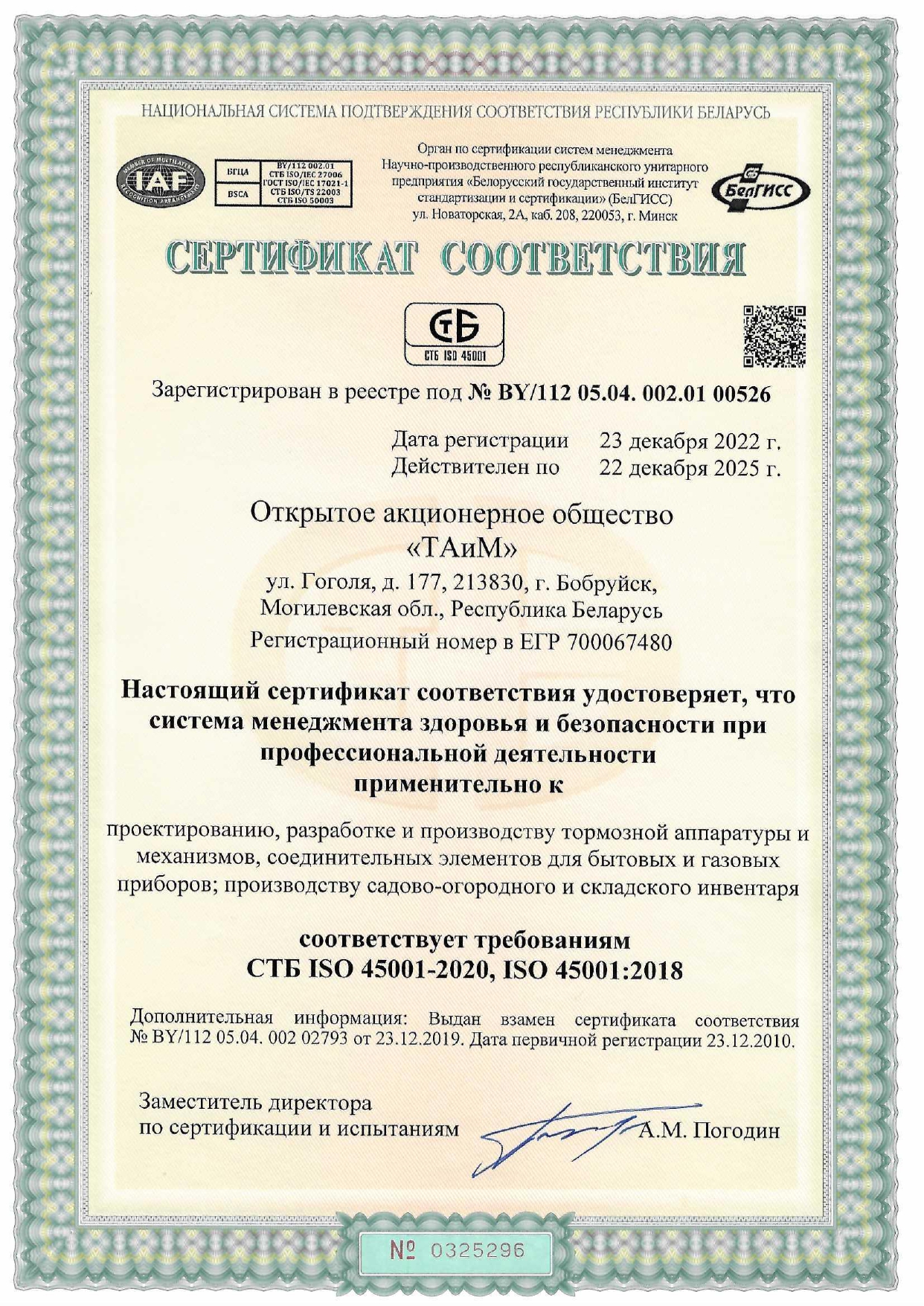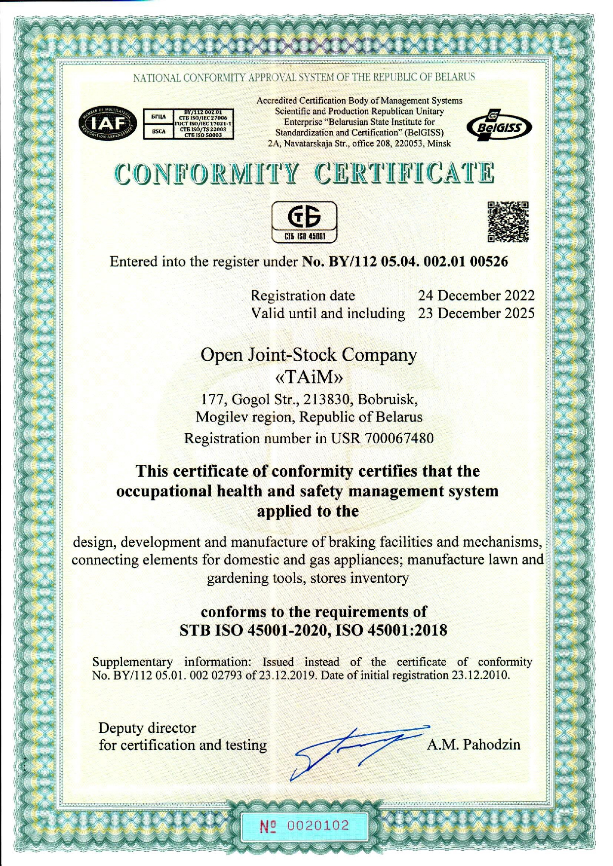 В 2019 году в ОАО "ТАиМ" разработана, внедрена и поддерживается система менеджмента охраны здоровья и безопасности труда в соответствии с международным стандартом ISO 45001:2018. Сертификат № HSM40870 от 12.09.2019. SAI GLOBAL.